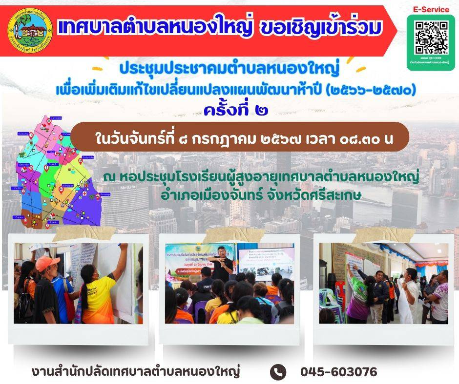 หัวข้อ :: เทศบาลตำบลหนองใหญ่ขอเชิญ  ประธานสภาเทศบาลตำบลหนองใหญ่ สมาชิกสภาเทศบาลตำบลหนองใหญ่ คณะผู้บริหาร หัวหน้าส่วนราชการ กำนันผู้ใหญ่บ้าน คณะกรรมการหมู่บ้านทั้ง ๑๒ หมู่บ้าน  เข้าร่วมประชุมประชาคมตำบลหนองใหญ่เพื่อเพิ่มเติมแก้ไขเปลี่ยนแปลงแผนพัฒนาห้าปี (๒๕๖๖-๒๕๗๐) ครั้งที่ ๒ วัตถุประสงค์เพื่อเก็บข้อมูลที่ได้จ