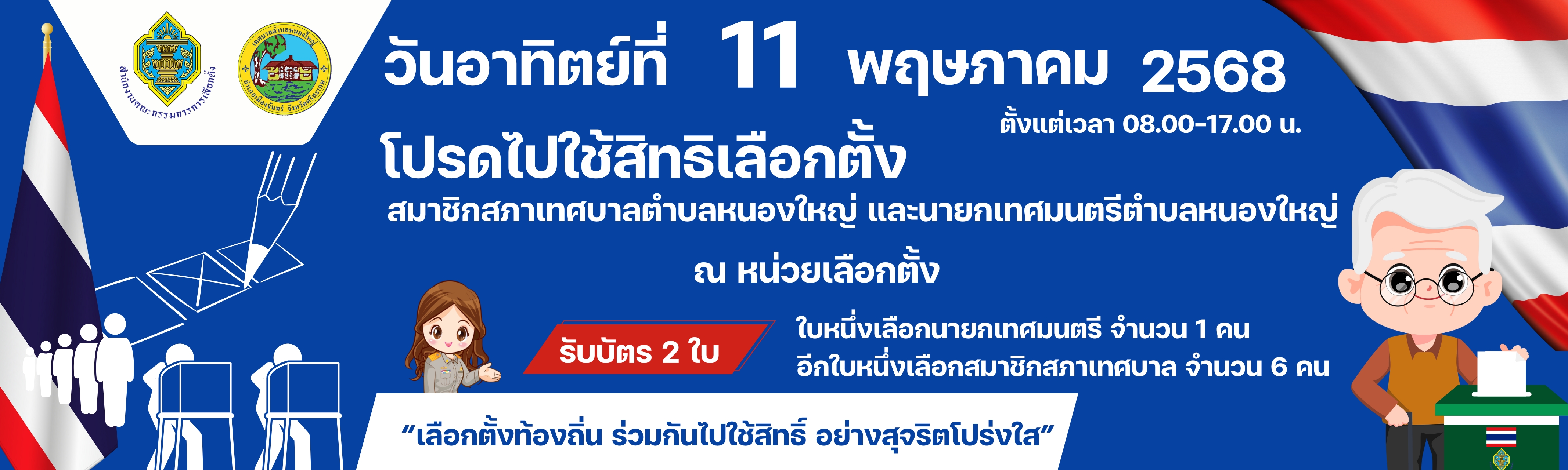 หัวข้อ :: วันอาทิตย์ที่ 11 พฤษภาคม 2568 ตั้งแต่เวลา 08.00-17.00 น. โปรดไปใช้สิทธิเลือกตั้ง สมาชิกสภาเทศบาลตำบลหนองใหญ่ และนายกเทศมนตรีตำบลหนองใหญ่ ณ หน่วยเลือกตั้ง รับบัตร 2 ใบ ใบหนึ่งเลือกนายกเทศมนตรี จำนวน 1 คน อีกใบหนึ่งเลือกสมาชิกสภาเทศบาล จำนวน 6 คน “เลือกตั้งท้องถิ่น ร่วมกันไปใช้สิทธิ์ อย่างสุจริตโปร